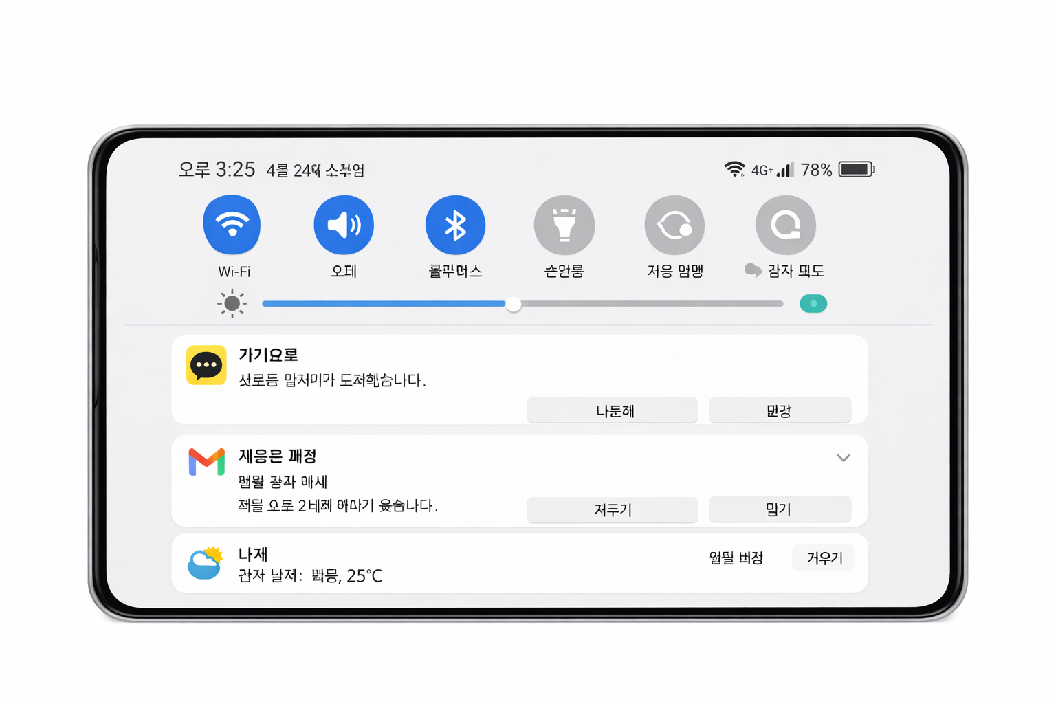 이 영역에서는 와이파이, 블루투스, 데이터 같은 주요 기능을 빠르게 제어할 수 있습니다.